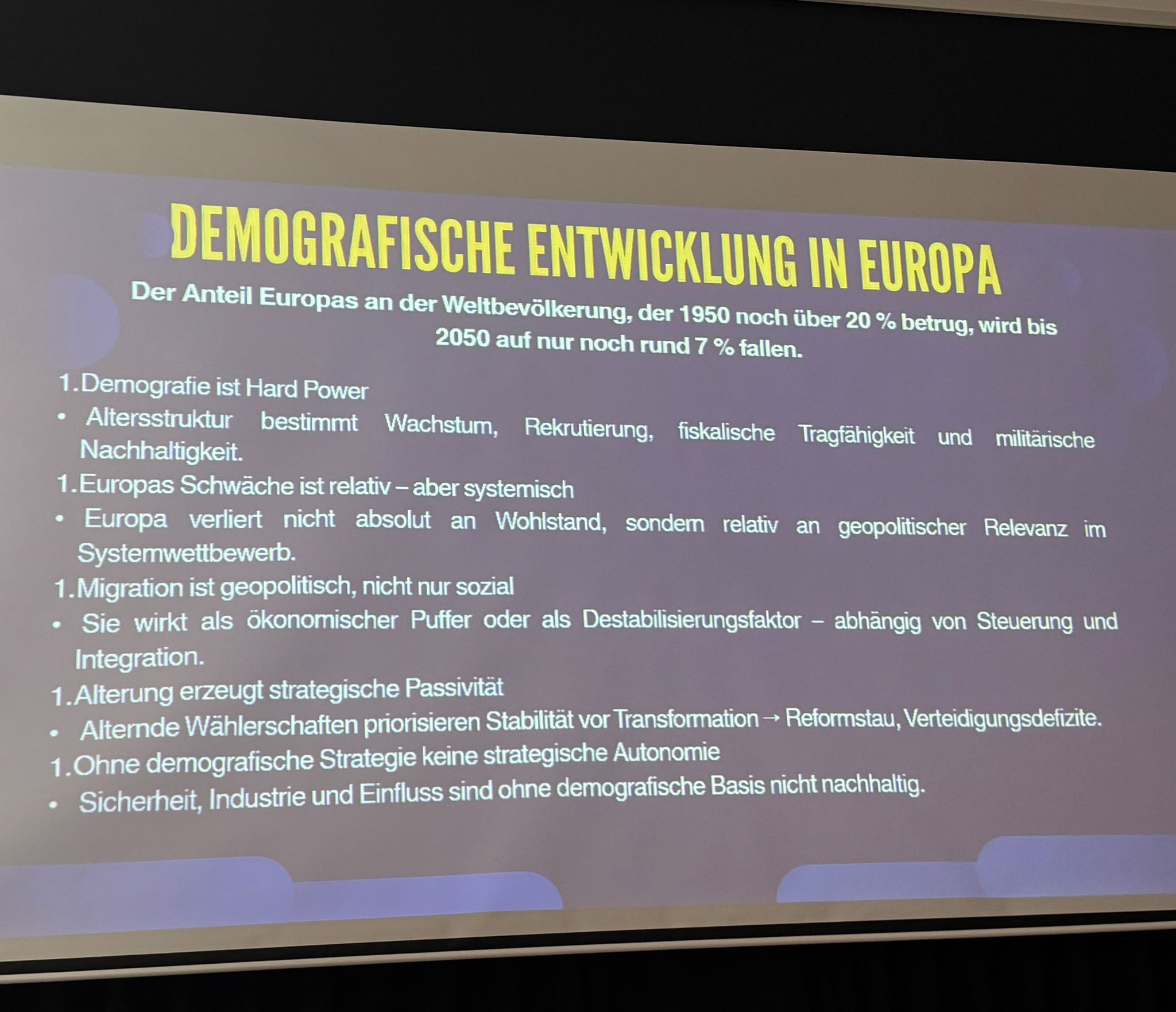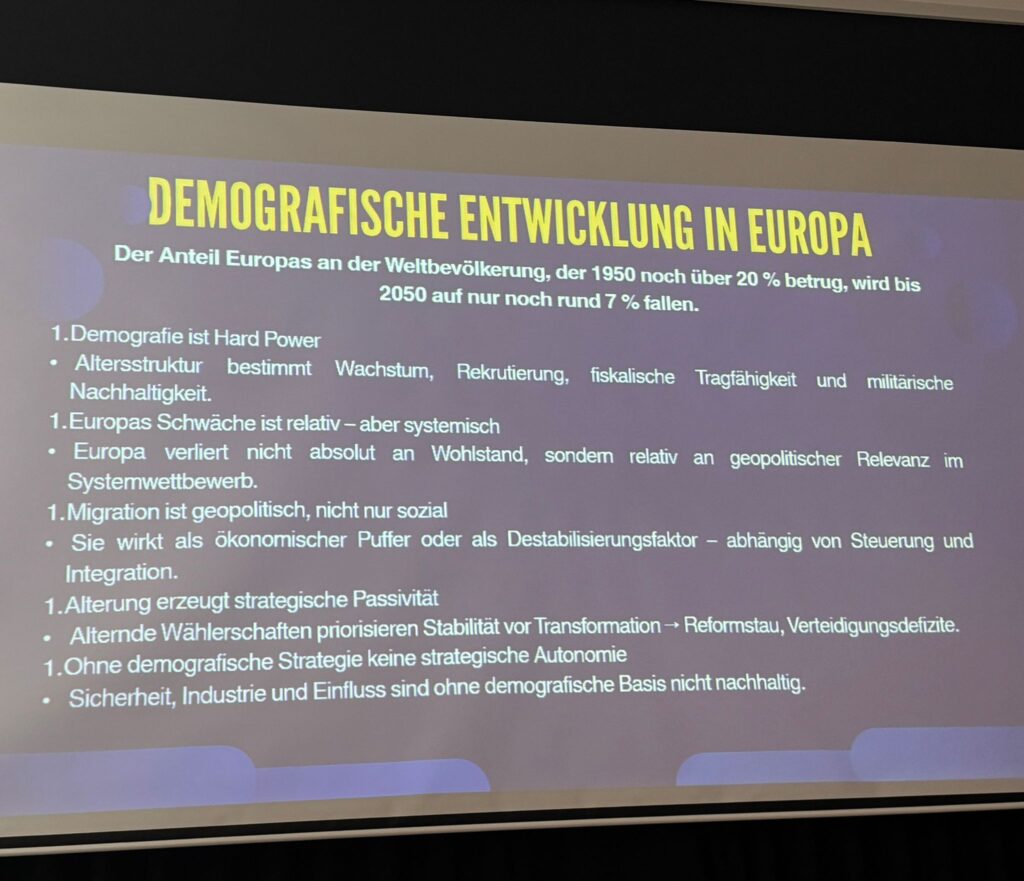 Europa ist die einzige Weltregion, für die die UNO einen absoluten Bevölkerungsrückgang vorhersagt – bereits ab etwa 2030 –, bedingt durch die seit den 1970er-Jahren sehr niedrigen Geburtenraten. Der Anteil Europas an der Weltbevölkerung, der 1950 noch 20% betrug, wird bis 2050 auf 7% fallen. Europa wird abhängig von Zuwanderung; wird systemisch geschwächt, Europa spielt weltweit dadurch eine deutlich kleinere Rolle. Um so mehr müssen wir zusammenarbeiten als EU. Alterung erzeugt strategische Passivität – Reformstaus und Verteidigungsdefizite entstehen; Sicherheit, Sozialstandards, Industrie und Einfluss in der Welt sind ohne demografische Basis nicht nachhaltig. Global governance, europäische „Soft Power“ und europäische Werte werden dadurch geschwächt. Zwischen dem Globalen Norden und dem Globalen Süden entsteht eine „Hard Power Competition“. Der Multilateralismus ändert sich – wer ist Mitglied im UNO-Sicherheitsrat, wer sitzt am Tisch der G7 oder G20?