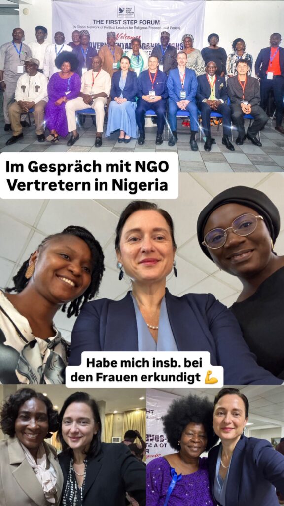 Wien, 31. März 2026 (ÖVP-PK) Die Nationalratsabgeordnete Dr. Gudrun Kugler, Sprecherin für Entwicklungszusammenarbeit (EZA) der ÖVP im Parlament, besuchte gemeinsam mit dem Leiter des First Step Forum, Abg. Marc Jost (Schweiz), sowie dem ehemaligen Premierminister der Slowakei, Eduard Heger, Nigeria, um sich vor Ort ein umfassendes Bild der Sicherheits- und Menschenrechtslage zu machen.