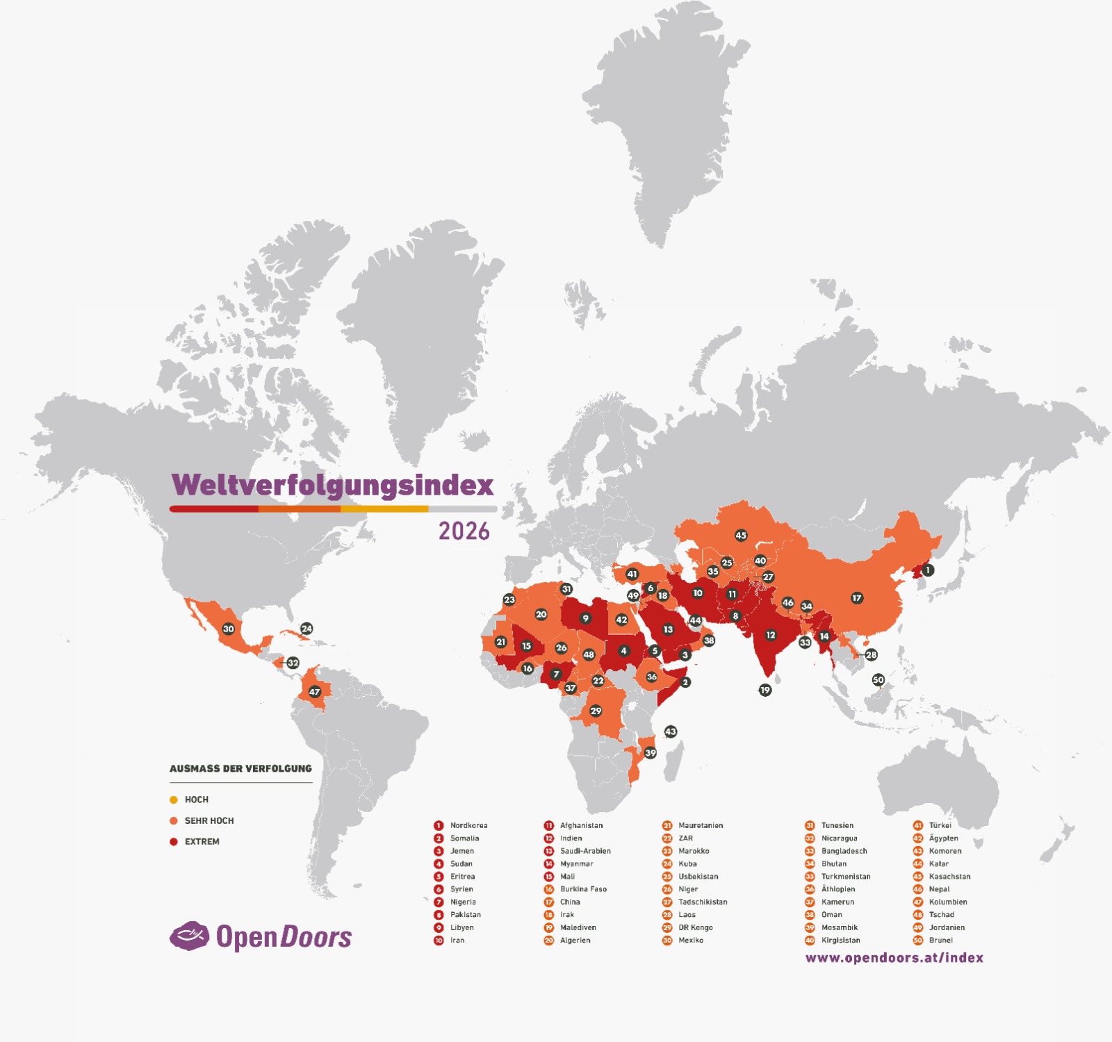 Unter diesem Link geht es zu den Daten von Open Doors: Weltverfolgungsindex 2026 · Im Dienst der verfolgten Christen weltweit · Open Doors
